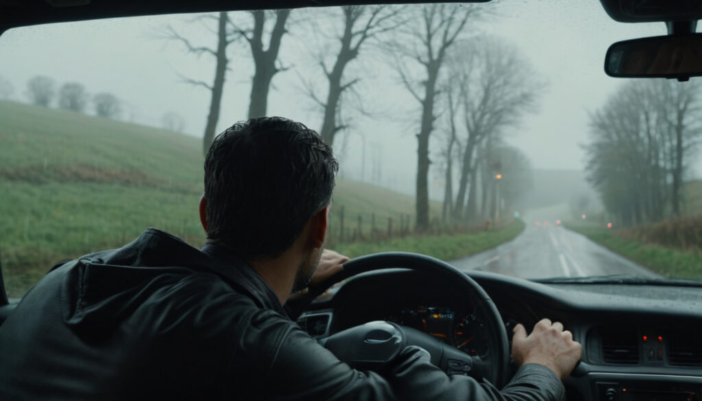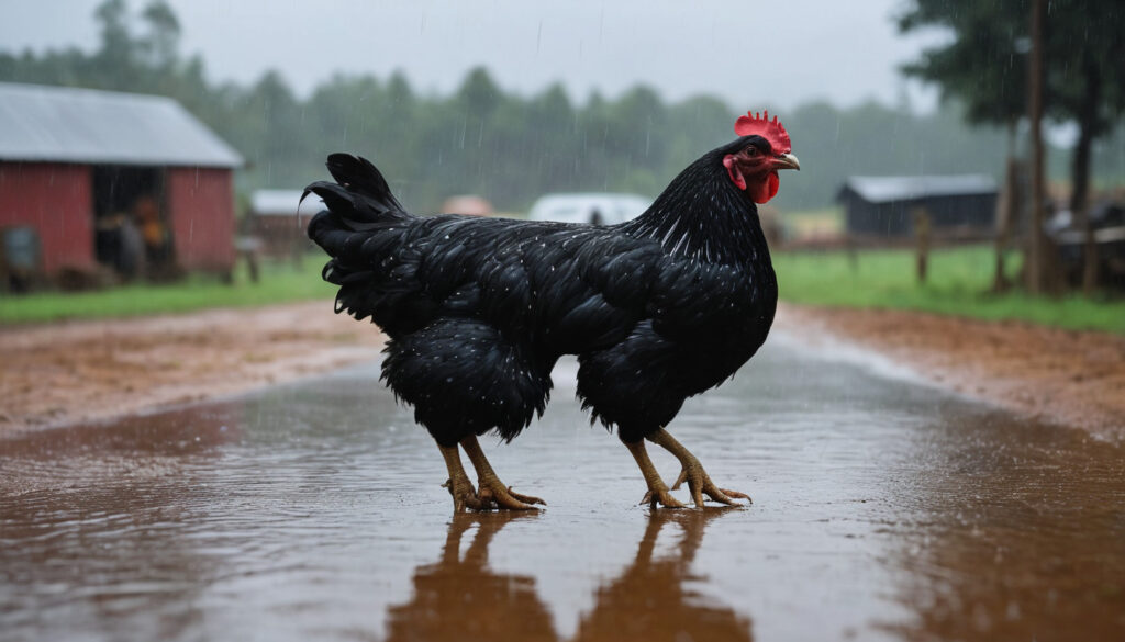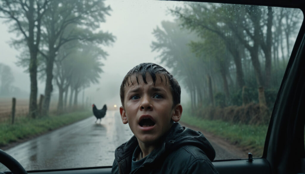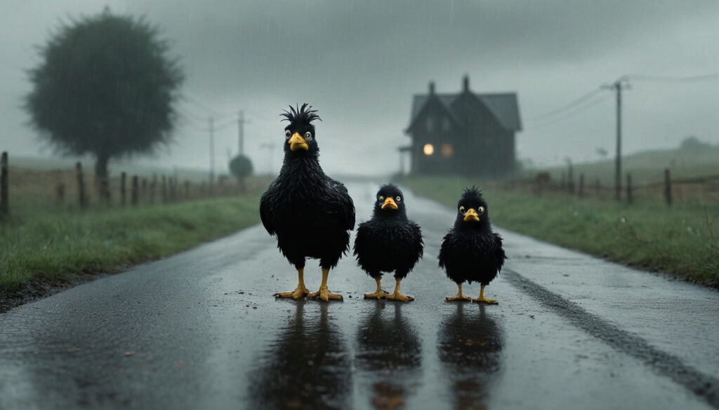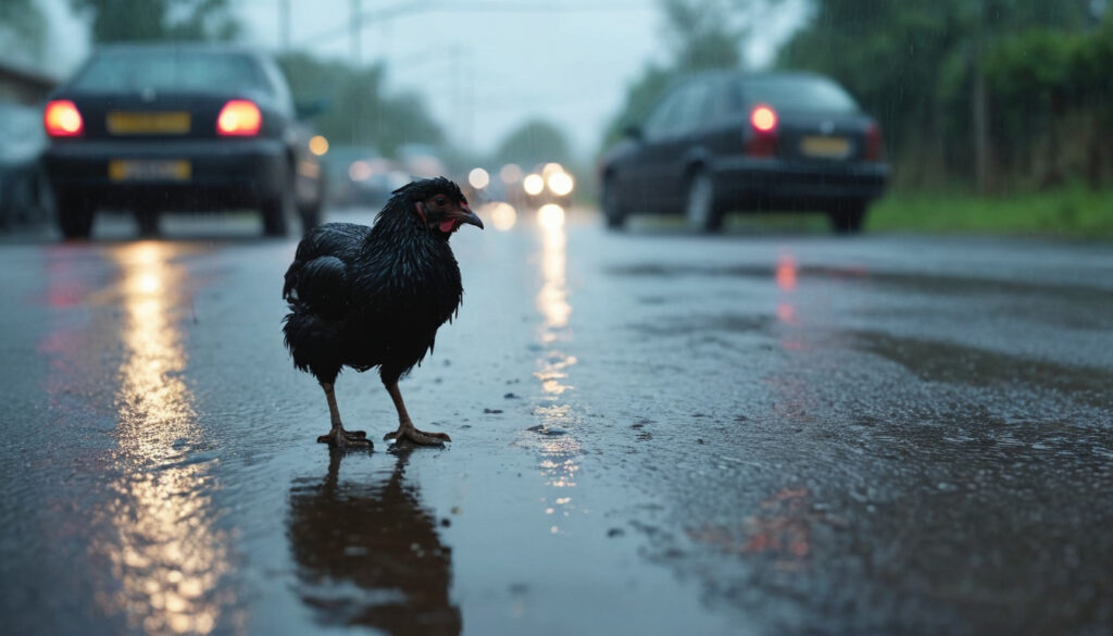 Chicken run: Everyday experience of a countryside road in the rainy morning