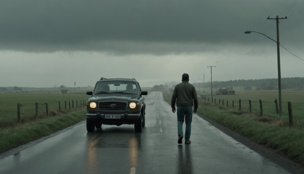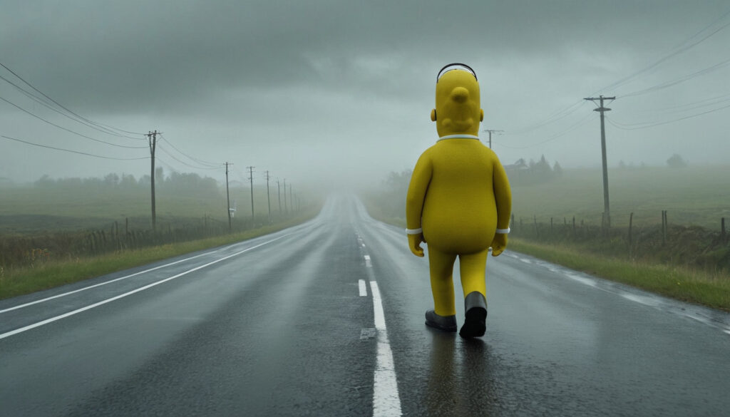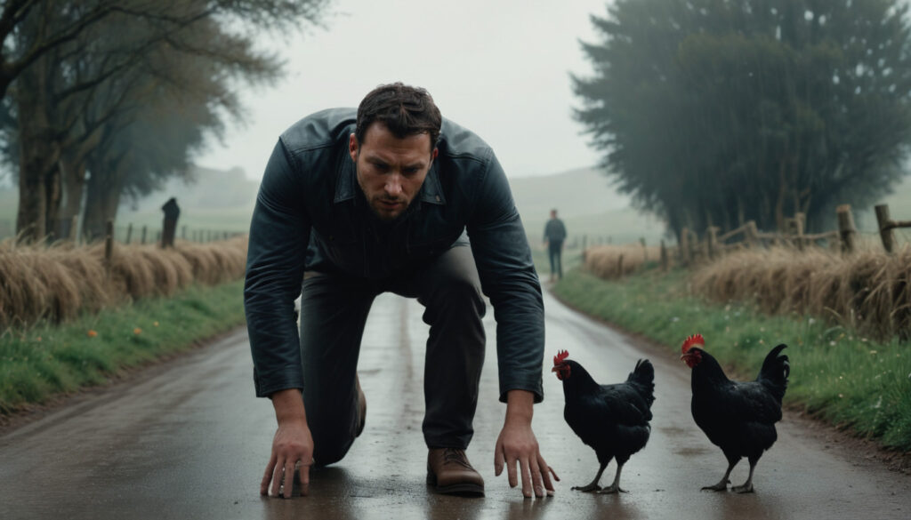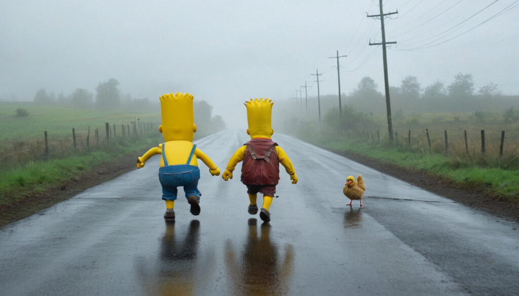 The little black chicken stands at the edge of the road, peering cautiously through the raindrops. Cars zoom past, splashing through puddles, creating a treacherous path that lies between the chicken and her chicken farm.Chicken man appears to be walking ghastly on the rainy roadChicken man appears to be really a Simpson’s chickenThe stranger drives the chicken safely to the other side of the road, near her chicken farm. The chicken hops out of the car, shaking off the raindrops from her feathers. She flaps her wings in excitement, knowing she’s almost home.