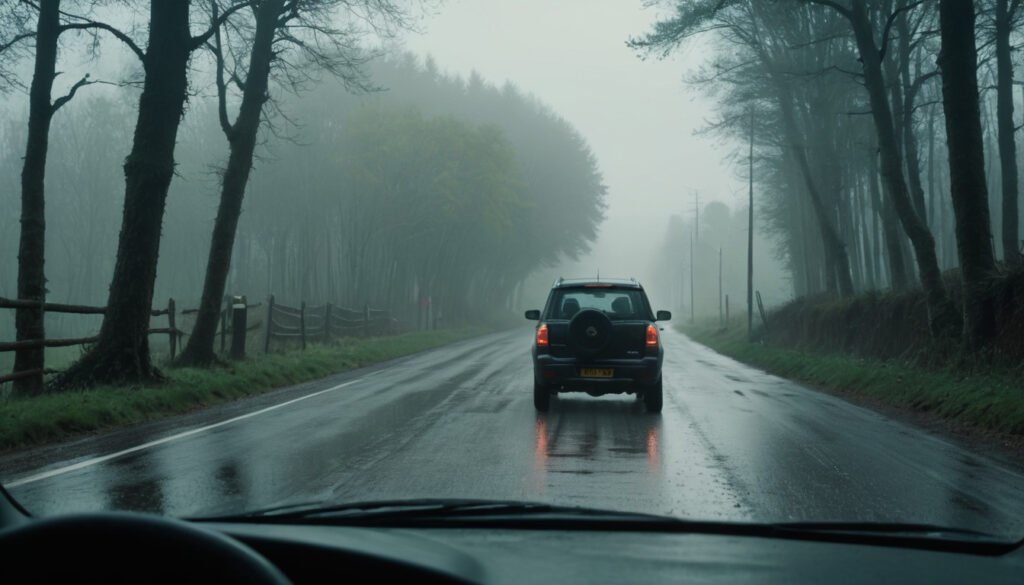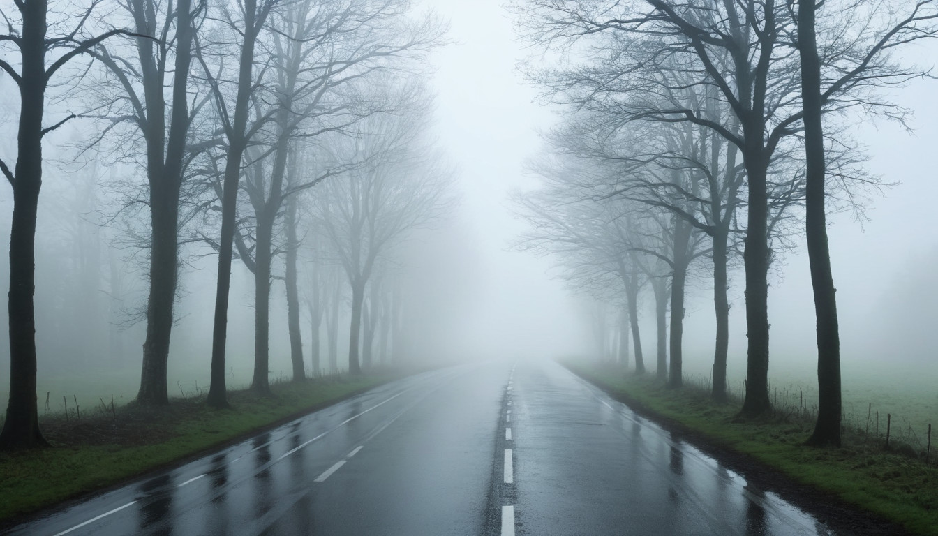 Everyday experience of a countryside road in the rainy morning. The rain is pouring and the fogs covering trees on both side of the road.